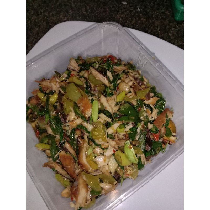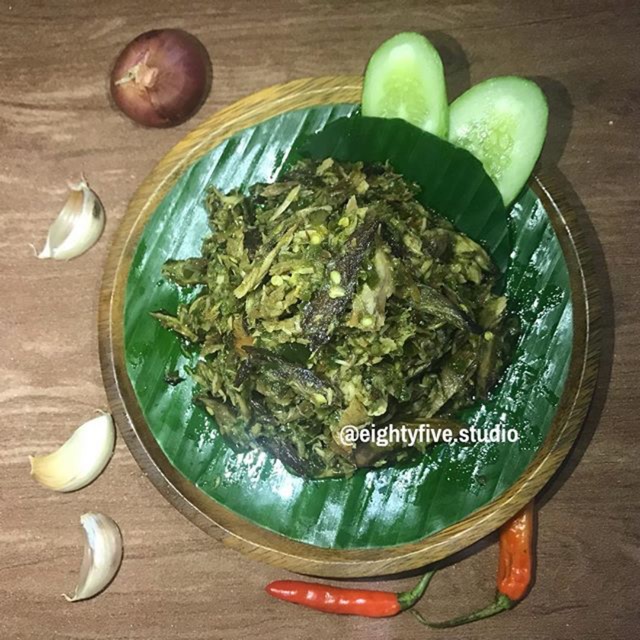 ● ikan tongkol yg udah dikukus 500 gram ● bawang merah 5 siung ● bawang putih 3 siung ● cabe rawit ● cabe hijau ● gula merah ● garam ● 1 jempol jahe ● 1 batang sereh ● daun salam ● daun jeruk ● garam ● penyedap (optional) ● daun bawang.